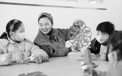 2月3日,志愿者教孩子们剪纸。    当日,安徽省滁州市来安县施官镇巾帼志愿者与留守儿童一起写福字、贴窗花、包饺子,喜迎新春。春节临近,针对许多在外务工人员响应号召留在异地过年,安徽多措并举做好留守儿童关爱工作,让孩子们感受家的温暖。    新华社记者 曹力/摄