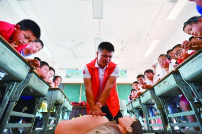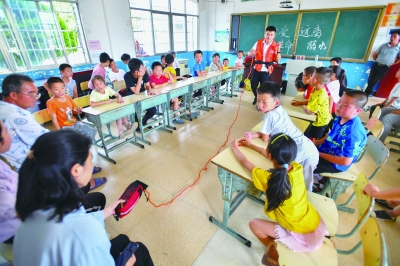 7月10日,湖南省湘潭市雨湖区姜畲镇大进村联合雨湖区蓝海豚社会工作服务中心,开展农村儿童暑假防溺水公益课堂活动。专业社工向家长和孩子们讲解防溺水常识,进行警示教育,教授安全急救技能,提高安全意识和自救能力。 新华社记者 陈泽国/摄