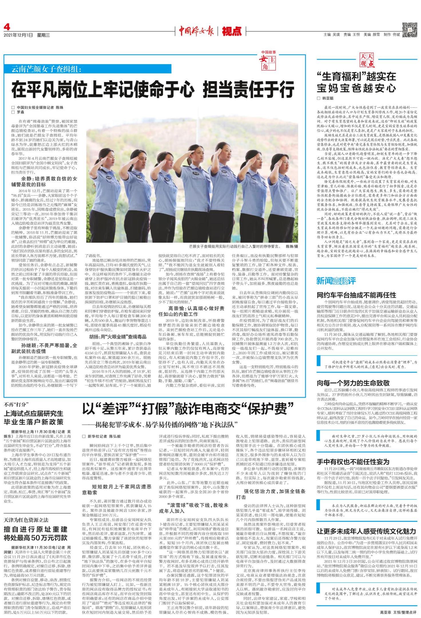 《中国妇女报》(电子版)的一切内容(包括但不限于文字、图片、PDF、图表、标志、标识、商标、版面设计、专栏目录与名称、内容分类标准以及为读者提供的任何信息)仅供中国妇女报读者阅读、学习研究使用,未经中国妇女报及/或相关权利人书面授权,任何单位及个人不得将《中国妇女报》(电子版)所登载、发布的内容用于商业性目的,包括但不限于转载、复制、发行、制作光盘、数据库、触摸展示等行为方式,或将之在非本站所属的服务器上作镜像。否则,中国妇女报将采取包括但不限于网上公示、向有关部门举报、诉讼等一切合法手段,追究侵权者的法律责任。