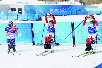 3月9日,北京冬残奥会越野滑雪女子短距离(坐姿组)比赛中,杨洪琼(中)夺得金牌。这是本届冬残奥会中国代表团获得的第10枚金牌。李盼盼(右)获得铜牌。