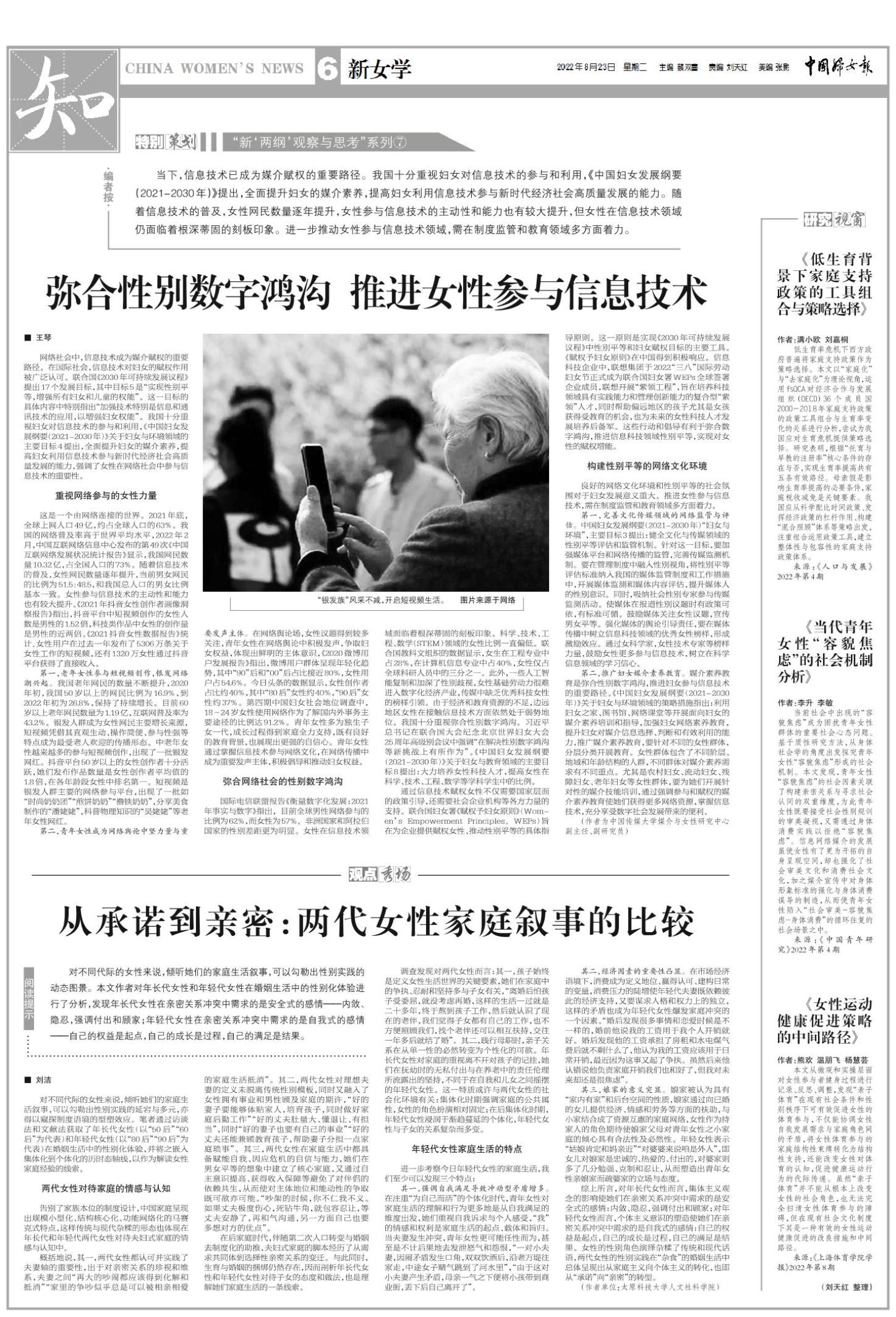 当下,信息技术已成为媒介赋权的重要路径。我国十分重视妇女对信息技术的参与和利用,《中国妇女发展纲要(2021-2030年)》提出,全面提升妇女的媒介素养,提高妇女利用信息技术参与新时代经济社会高质量发展的能力。随着信息技术的普及,女性网民数量逐年提升,女性参与信息技术的主动性和能力也有较大提升,但女性在信息技术领域仍面临着根深蒂固的刻板印象。进一步推动女性参与信息技术领域,需在制度监管和教育领域多方面着力。