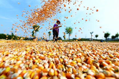 10月8日,山东省临沂市郯城县马头镇柏花园村的农民在晾晒玉米。金秋十月,各地农民抢抓农时,晾晒收获的玉米、稻谷等,乡间呈现出金色的丰收图景。 新华社发(房德华/摄)