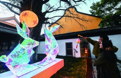 1月29日,在嘉兴市秀洲区新塍古镇小蓬莱公园内,游客在观赏“鳌山灯会”的兔子彩灯。 当日,有数百年历史的浙江省嘉兴市秀洲区新塍古镇元宵民俗“鳌山灯会”正式亮灯,现场彩灯交相辉映,五彩斑斓。除了民俗灯展外,“鳌山灯会”现场还有蛋画、银杏画、纸扎灯等非遗文化民俗展示。 新华社记者 徐昱/摄