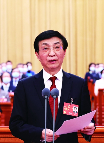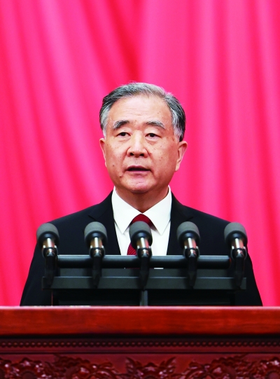 下午3时,王沪宁宣布大会开幕,全体起立,高唱中华人民共和国国歌。