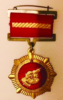 全国妇女建设社会主义积极分子章为八角星造型,黄铜镀金,正中铸刻两名妇女的半身像,背景为火箭升空图和象征阳光的红色放射线,外圈的环形上部为五角星和麦穗、齿轮图案,分别代表党的领导和工农联盟,下部环刻“全国妇女建设社会主义积极分子章”铭文,具有鲜明的时代特色。1958年12月,为交流经验,表彰先进,推动工作,中华全国民主妇女联合会在北京召开全国妇女建设社会主义积极分子代表大会,大会组委会向每位代表颁发了“全国妇女建设社会主义积极分子章”,激励广大妇女为建设社会主义奋勇前进。这枚奖章是山东省东营市广饶县三柳树村妇女模范李田英所获。