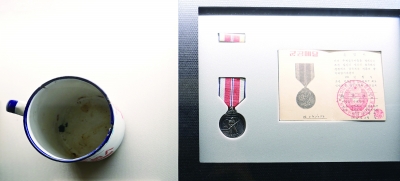 “赠给最可爱的人”搪瓷缸子和马兖生1954年获得的朝鲜政府慰问中国人民志愿军军功章 杨睿/摄