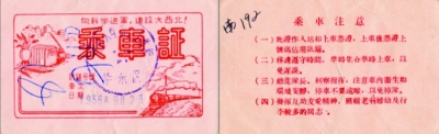 1955年,基于社会主义工业化建设和国防形势的需要,党中央、国务院决定交通大学由上海内迁西安。1956年,数千名交大师生“听党指挥跟党走”“打起背包就出发”,登上了“向科学进军,建设大西北”的西迁专列,开启了西部创业的征程。这张乘车证是当年交大西迁专列的特制乘车证,乘车证正面左上角印有拔地而起的高楼,书桌上摆放着书、笔墨和盛开的鲜花,象征着崭新的校园环境优美,新中国的教育事业前程似锦。右下角有晴空万里、蓝天白云、银鹰翱翔的图案,一列满载交大师生的火车飞驰电掣,穿行在祖国的壮美山川之中。票面中间,上部“乘车证”三个大字赫然醒目,上方印有“向科学进军,建设大西北!”字样,下方印有卧铺号码、车次与日期信息,并盖有“交通大学招生工作组华东区”大印。背面是乘车注意事项,一共四条。这张乘车证承载着交大人如火如荼的激情岁月,也是彰显“西迁精神”的重要展品之一。