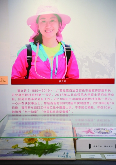 黄文秀,生前系广西壮族自治区百色市委宣传部副科长、乐业县百坭村驻村第一书记。2016年从北京师范大学研究生毕业后,黄文秀放弃了留在大城市的机会,回到家乡工作。2018年,她主动请缨到百坭村担任驻村第一书记,她翻山越岭,挨家挨户走访,带领村民们修公路、建蓄水池、种植砂糖橘、建设标准化果园、拓展销路并发展多种产业,仅用了一年多时间,百坭村88户贫困户实现脱贫,村集体经济项目增收翻倍。2019年6月16日晚,黄文秀在冒雨连夜返回工作岗位途中遭遇山洪,不幸因公牺牲,年仅30岁,被追授“七一勋章”“全国脱贫攻坚楷模”“最美奋斗者”荣誉称号。
