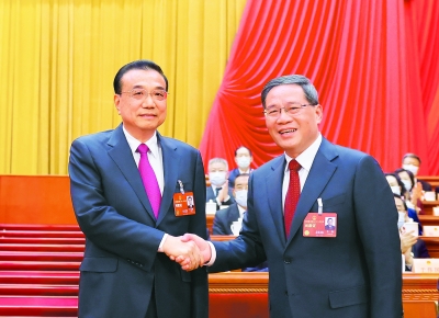 3月11日,十四届全国人大一次会议在北京人民大会堂举行第四次全体会议,根据国家主席习近平的提名,经过投票表决,决定李强为中华人民共和国国务院总理。这是李强同李克强握手。     新华社记者 黄敬文/摄
