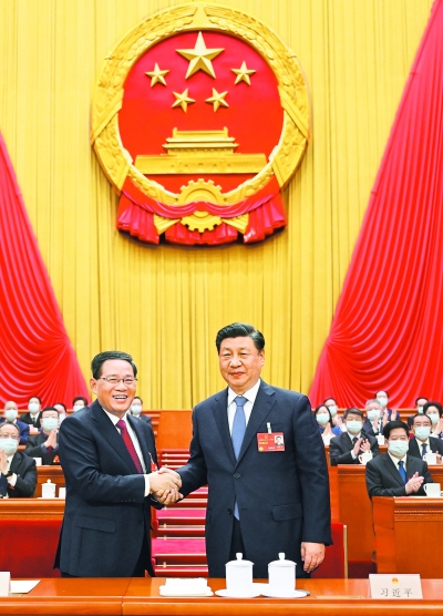 3月11日,十四届全国人大一次会议在北京人民大会堂举行第四次全体会议,根据国家主席习近平的提名,经过投票表决,决定李强为中华人民共和国国务院总理。这是习近平同李强握手。    新华社记者 李学仁/摄
