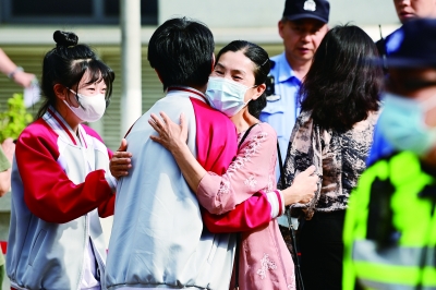 走近北京汇文中学门口,便能听到此起彼伏的加油声。记者在校门口看到,有家长轻抚孩子的后背,有家长用目光传递力量。送考队伍中,老师群体依旧最“燃”,不断与走过来的每一名考生击掌拥抱、传递能量。