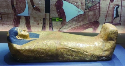 在展览大厅躺着一个金光闪闪的“木乃伊”,这也是这次展览最重要的展品——公元一世纪的镀金木乃伊棺椁。棺椁的主人是一位生活在罗马时期的年轻贵族女子,棺椁全身使用了耀眼的金箔,并细致地描绘了她理想化的面孔。资料介绍说,这是“她”第一次离开巴塞罗那埃及博物馆展出。特展上还展出了5件木质彩绘古埃及木乃伊棺椁及棺盖,都是直立的,观众可以看到四周的样子。