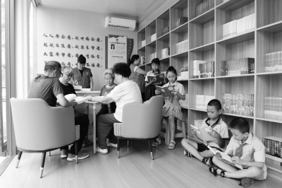 8月15日,在山西省阳泉市城区阳坡垴社区新建的银发书屋内,老年人和孩子们正在聚精会神专心致志地阅读学习。