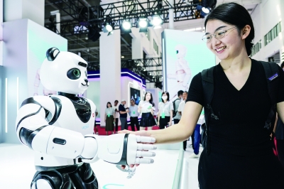 8月16日,一位女士与智能机器人握手。当日,2023世界机器人大会在北京开幕,本次大会的主题为“开放创新 聚享未来”,包含论坛、博览会、机器人大赛等活动。新华社记者 彭子洋/摄