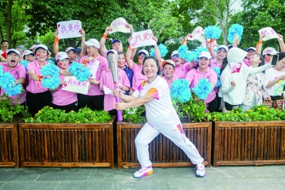 “加油!加油!”在一声声加油声中,火炬传递来到了第三棒。奥运冠军、前国家队跳水运动员郭晶晶的出现,引起了阵阵欢呼声。