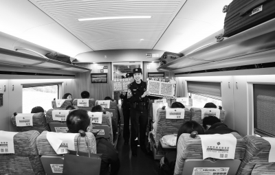 10月16日,沈阳铁路公安局沈阳公安处乘警支队女子乘务大队民警在列车上向乘客进行反诈骗宣传。 当日,沈阳铁路公安局沈阳公安处乘警支队女子乘务大队民警走进高铁车厢向乘客进行反诈骗宣传和安全乘车宣传,增强乘客保护人身和财产安全的意识。 新华社记者 龙雷/摄
