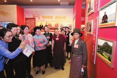 ▲10月25日下午,中国妇女十三大部分代表来到中国妇女儿童博物馆参观。图为“七一勋章”获得者卓嘎代表在参观“中国妇女儿童事业发展十年成就展”时与自己照片合影留念。