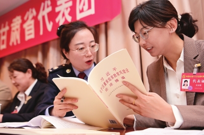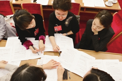 ▲10月22日,出席中国妇女十三大的陈艳代表(右二)与吴祎蓉代表(右一)在代表团会议上学习《习近平关于注重家庭家教家风建设论述摘编》。