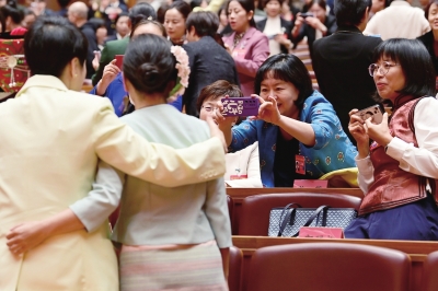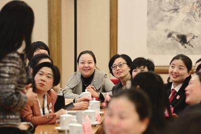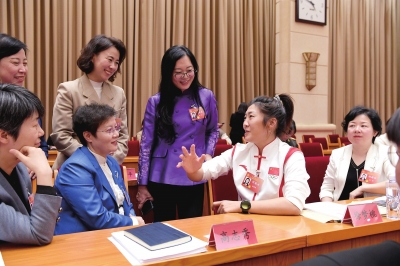 ▲10月25日,全国妇联十三届一次执委会议在北京京西宾馆举行。这是休会时,徐梦桃代表(右二)给其他代表讲述自己的冠军故事。 中国妇女报全媒体记者 杨睿/摄
