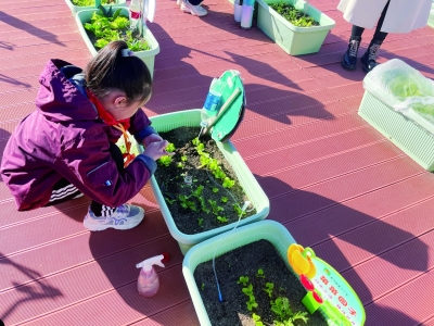 孩子们科学养护着小菜园,还动手搭起了温室棚,通过动手更有乐趣地学到科学知识。“它的主要原理是热空气上升,大棚可以把热空气阻挡,使它保存在大棚内,可以让植物过一个温暖的冬天,更快速地生长。”五年级四班的邵思博仔细地讲解着其中的科学道理。