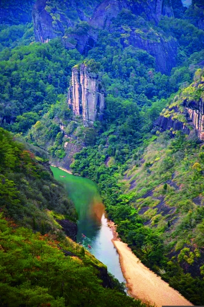 武夷山有“不到天游等于白游”一说。登上峰顶,眼前豁然开朗,极目皆油画。远处千峰竞秀,山脚九曲环碧,溪山之胜尽收眼底。武夷之水精华在九曲溪,溪水碧清,曲曲弯弯,如玉带盘绕群峰,山回溪折,折复绕山,环结成“曲曲山回转,峰峰水抱流”的九曲之胜。溪中,一排排竹筏随波逐流而下,竹筏上的游客们与峭壁上的参赛队员们隔空互动,喊声、笑声、加油声响彻山谷……