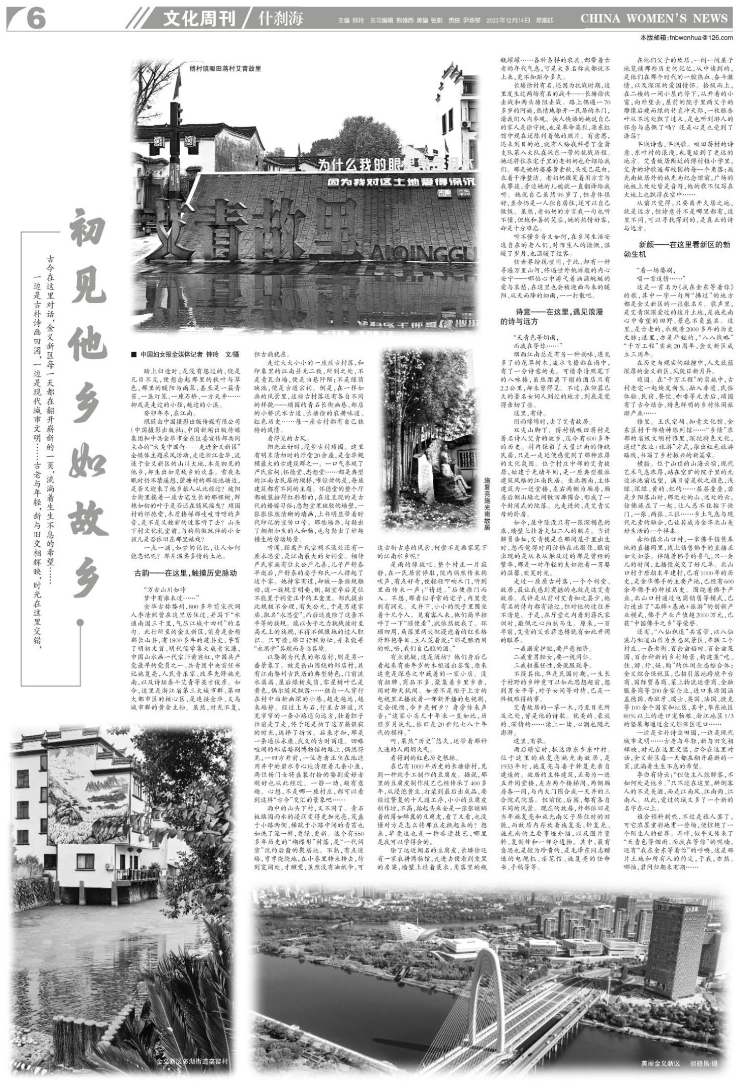 跟随由中国摄影出版传媒有限公司(中国摄影出版社)、中国新闻出版传媒集团和中共金华市金东区委宣传部共同主办的“大美中国行——走进金义新区”全媒体主题采风活动,走进浙江金华,流连于金义新区的山川大地,本是初见的他乡,却生出如见故乡的欢喜。雪夜未眠时仍不禁遥想,蒲塘村的那些池塘边,是否又迎来了他乡旅人从此经过?坡阳古街里挨着一座古宅生长的那棵树,鲜艳如初的叶子是否还在随风摇曳?琐园村的怀德堂,木质楼梯那吱吱呀呀的声音,是不是又被新的过客听了去?山头下村文化礼堂前,与狗狗做玩伴的小女孩儿是否依旧在那里嬉戏?
