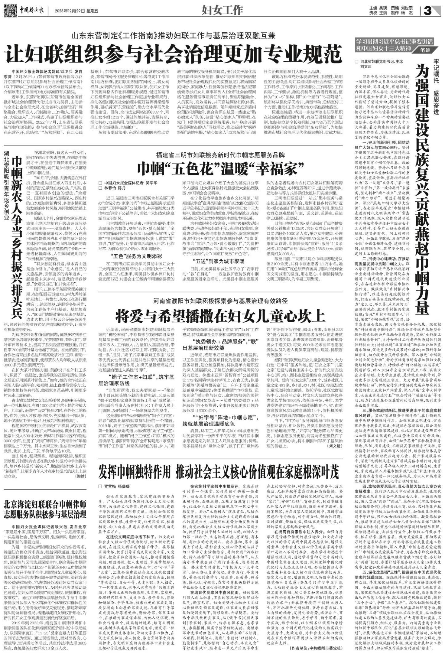 在培育优良家风中春风化雨。好的家风引领人向上向善,不良的家风却会败坏社会风气,贻害无穷。妇女要坚持以社会主义核心价值观引领家风建设,让家庭成员在好家风的浸润熏陶下,潜移默化、升华境界。要传承中华民族优良家风,从《诫子书》《颜氏家训》等家训、家规中,传承自强不息、忠孝节义、赤诚报国、诚实守信等传统美德。要继承革命先辈的红色家风,从毛泽东的“不经商、不赚钱、低调做人、清廉”、朱德的“以德树人,勤俭持家”、焦裕禄的“自己动手,丰衣足食”等红色家风中,继承老一辈无产阶级革命家身上的坚守信仰、对党忠诚、艰苦奋斗、清正廉洁、无私奉献等崇高信念和高尚情操。要从严治家,时刻以严格的家风律己律人,把好“家门”、守好“后院”、育好后代,时刻警醒自己和家人严守红线底线,做到关爱不溺爱、善待不纵容,并在与家人交流沟通中,及时掌握思想和行为动态,对于苗头性、倾向性问题,及时提醒、帮助改正,保证家庭风清气正,以好的家风支撑起社会好风气。