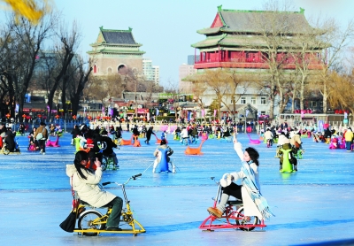 1月4日,北京白天气温回暖,已对外开放运营一周的什刹海冰场持续火热。记者在现场注意到,冰场上既有赶来沉浸式体验老北京人文风貌的年轻人,也有滑冰多年的老北京人。据了解,今年什刹海冰场开放区域达16万平方米,除了往年常设的单双人冰车、冰上自行车区域及速滑区,还增设了近5000平方米的滑冰培训区,配备了专业滑冰教练员。