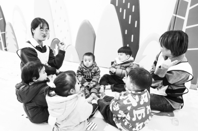 在太阳镇邻里中心的婴幼儿成长驿站内,青年志愿者带着孩子在玩耍。