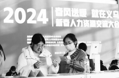 1月6日,在浙江省义乌市新春人力资源交流大会现场,求职者了解用人信息。 当日,浙江省义乌市举行2024新春人力资源交流大会,200余家企业提供5000余个工作岗位进场招聘,岗位涉及商贸类、物流类等领域。为方便求职者和企业之间的交流,招聘会现场设有校企对接专区、劳务协作基地对接区、直播带岗专区、人力资源机构服务区等特色区域,为参会人员提供一站式就业服务体验。