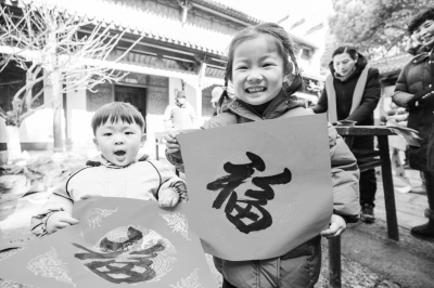1月23日,浙江省湖州市德清县钟管镇文联、妇联开展“笔墨迎新春 春联送祝福”活动,组织书法志愿者走进乡村、社区、企业、建筑工地等场所,为人们书写春联和福字,迎接春节的到来。图为小朋友展示福字。
