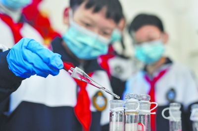 3月20日,在山东省青岛市市北区宁安路小学开展的“滴水在指尖 节水在心间”主题活动上,一名学生在做污水净化小实验。 为迎接即将到来的世界水日,各地举办形式多样的主题活动,增强人们的节水护水意识。 新华社发(王海滨/摄)