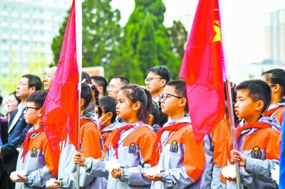 4月2日,少年儿童在济南英雄山革命烈士陵园缅怀先烈。   清明节将至,山东省济南市各界群众来到英雄山革命烈士陵园缅怀历史,祭奠先烈。