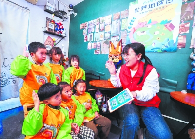 4月17日,在浙江省湖州市吴兴区龙泉街道西白鱼潭社区,志愿者给幼儿园小朋友普及世界地球日的知识。    世界地球日来临之际,浙江省湖州市吴兴区龙泉街道社区、辖区内学校开展丰富多彩的主题活动,推广生态环保理念,倡导绿色低碳生活方式。新华社记者 徐昱/摄