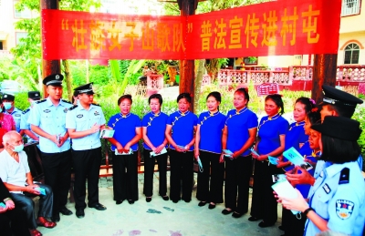把“民警想讲的”变成“群众爱听的”,把“群众爱听的”融进“民警想讲的”,壮族女子山歌队用接地气的方式把法律知识送进边境辖区的千家万户,为边境地区和谐稳定打下了坚实的群众基础。“壮语普法村村讲,普法山歌处处唱”的良好局面在南疆国门蔚然成风。