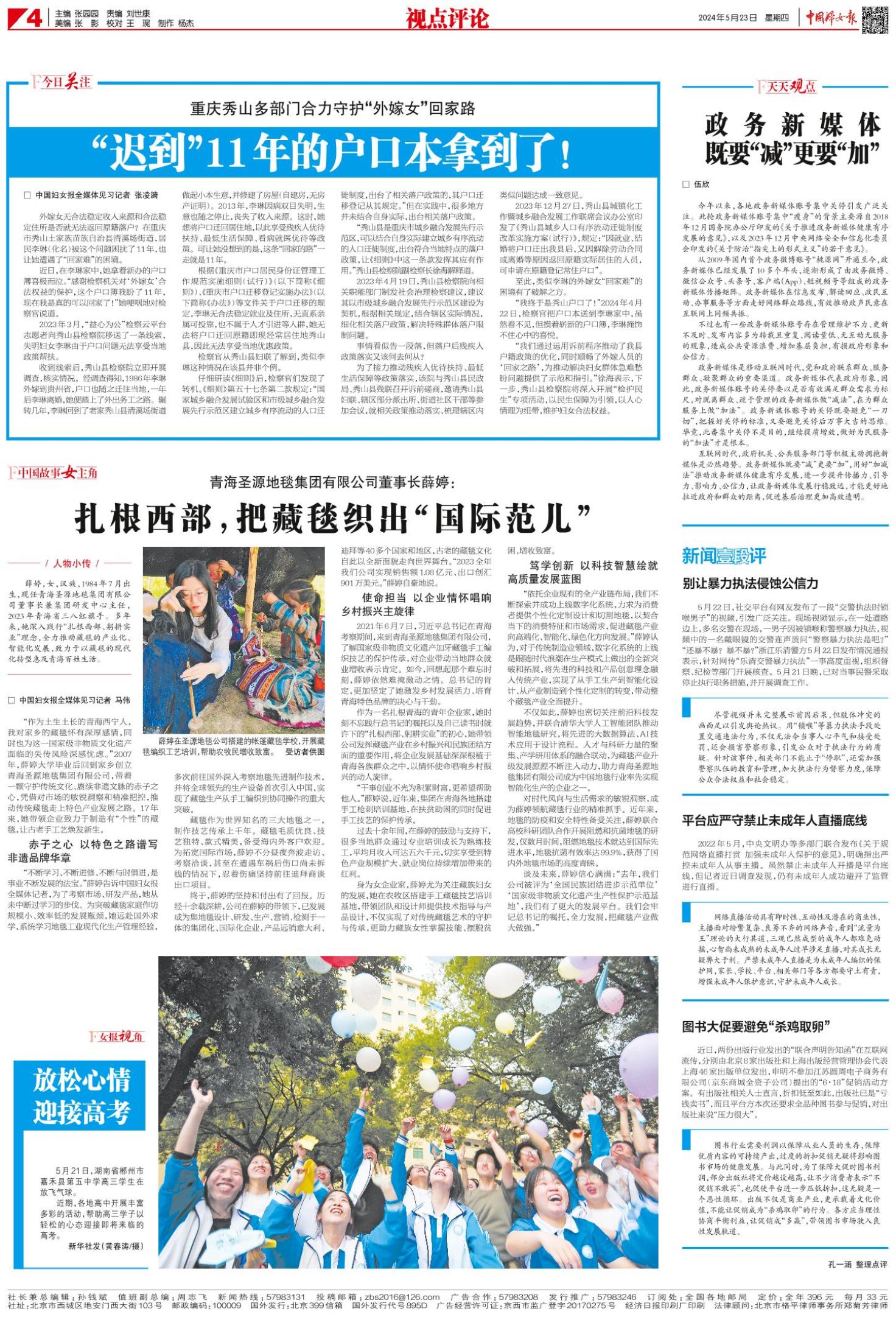 《中国妇女报》(电子版)的一切内容(包括但不限于文字、图片、PDF、图表、标志、标识、商标、版面设计、专栏目录与名称、内容分类标准以及为读者提供的任何信息)仅供中国妇女报读者阅读、学习研究使用,未经中国妇女报及/或相关权利人书面授权,任何单位及个人不得将《中国妇女报》(电子版)所登载、发布的内容用于商业性目的,包括但不限于转载、复制、发行、制作光盘、数据库、触摸展示等行为方式,或将之在非本站所属的服务器上作镜像。否则,中国妇女报将采取包括但不限于网上公示、向有关部门举报、诉讼等一切合法手段,追究侵权者的法律责任。