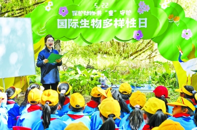 5月22日,拉鲁湿地国家级自然保护区管理局局长拉姆次仁在活动中邀请小学生做“小小宣讲员”和“拉鲁湿地小卫士”。 当日是国际生物多样性日,拉鲁湿地国家级自然保护区管理局组织工作人员,为拉萨市城关区拉鲁小学的学生们带来一堂生动的“保护生物多样性,共建和谐湿地”科普自然教育课。