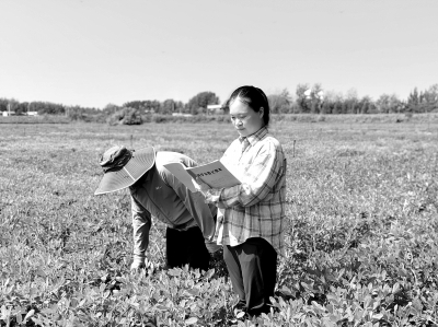 近日,在河南省商丘市梁园区双八镇的商丘市农林科学院试验示范中心,副研究员张枫叶正在花生育种试验田调查花生后期病害。