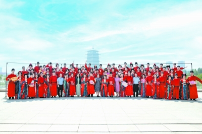 在庄重典雅的礼乐声中,身着仿唐制改良婚服的新人走上舞台,在众人的见证下,许下结婚誓言,发出争做中华家庭美德的传承者、新型婚育文化的引领者、社会主义家庭文明新风尚的践行者倡议:风雨同行,为爱不离不弃;相知相守,共建和美家庭。