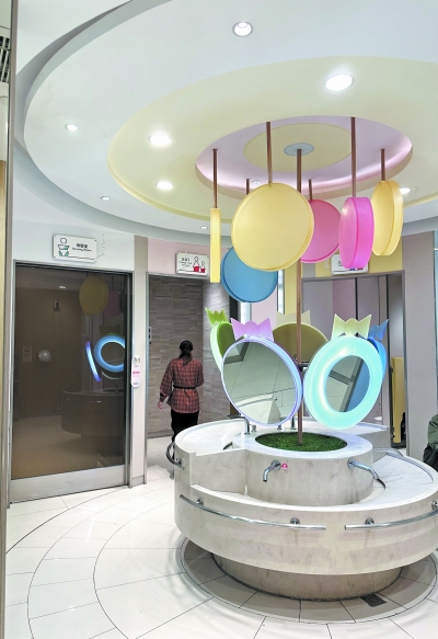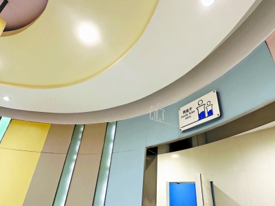 在商场内,记者看到二楼和三楼分别设有亲子卫生间。亲子卫生间里空间宽敞,淡粉色和淡蓝色的色彩搭配十分温馨,公共区域里的环形洗手台有着高低区分,方便父母和孩子分别使用,让人感受到亲子友好、儿童友好的氛围。与记者想象中简单地增加了“父婴室”不同,亲子卫生间对区域进行了较为细致的划分——以环形洗手台为中心,周围环绕设置了母婴室、“女亲子卫生间”、儿童卫生间和“男亲子卫生间”,可以说照顾到了不同群体的多样化需求。