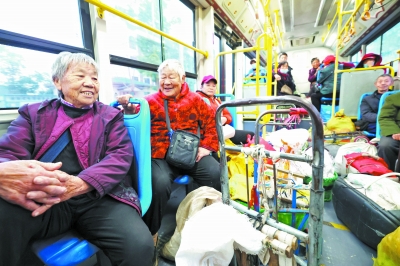 10月28日,菜农搭乘湖北省襄阳市505路公交车“爱心菜农专线”。 近期,湖北省襄阳市的505路公交开通“爱心菜农专线”。该专线每日6时30分发车,采用“大站快运”的运输模式,为城郊菜农提供了便捷实惠的出行方式。新华社发(杨东/摄)