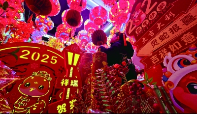 随着蛇年春节临近,年味儿越来越浓。年货市场中,各种喜庆、吉祥的新年饰品琳琅满目,其中灯笼、福字、春联、中国结等具有节日喜庆元素的饰品最受青睐。市民在年货挑选中感受着渐浓的年味儿,也体验着传统文化的独特魅力。中国妇女报全媒体记者 杨睿/摄