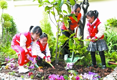 3月12日,云南省丽江市新苗幼儿园的小朋友和老师一起栽植树苗。当日是植树节,各地开展植树活动,为春天增绿添彩。