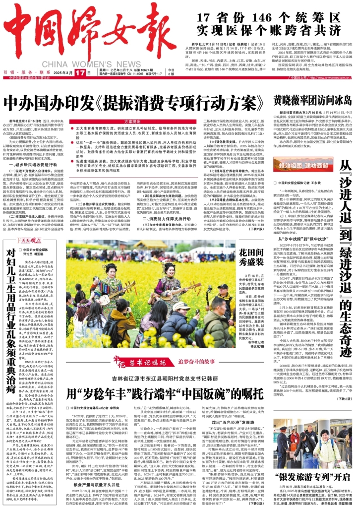 17省份146个统筹区实现医保个账跨省共济 黄晓薇率团访问冰岛 从“沙进人退”到“绿进沙退”的生态奇迹 “银发旅游专列”开启 中办国办印发《提振消费专项行动方案》 花田间 秀盛装 对妇儿卫生用品行业乱象须重典治疴 用“岁稔年丰”践行端牢“中国饭碗”的嘱托