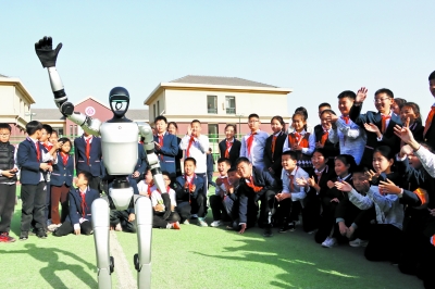 图为机器人“同学”和学生们打招呼。