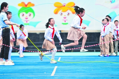 4月10日,学生们在大课间跳绳。 春日里,广西壮族自治区柳州市潭中路第二小学总部积极开展丰富多彩的阳光体育大课间活动,将啦啦操、武术操、跳绳、趣味游戏等项目融入体育运动中,提高学生身体素质,让孩子们在紫荆花盛开的校园里,快乐运动,健康成长。