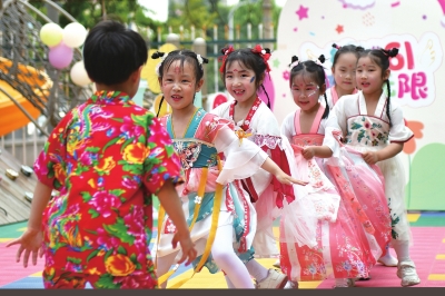 5月29日,山东省烟台市福山区城西幼儿园的小朋友在玩老鹰捉小鸡游戏。 近日,各地举行丰富多彩的活动,迎接“六一”国际儿童节。新华社发(孙文潭/摄)