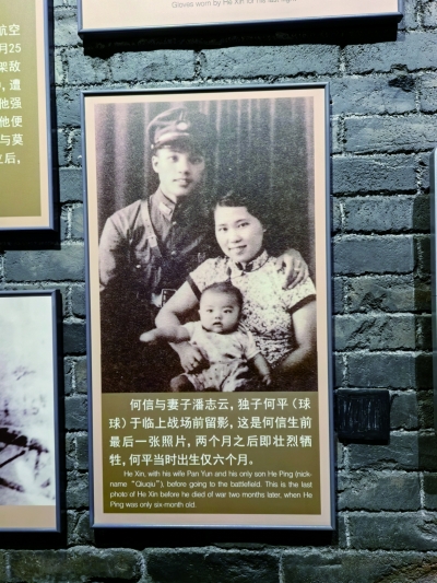 在纪念馆庄严肃穆的展区内,有一张黑白全家福格外引人注目。这是抗战英雄、飞行员何信烈士与妻儿的合影。照片拍摄于1937年,泛黄的画面中,身着飞行服的何信正抱着6个月大的儿子何平,年轻的妻子温柔地倚靠在他的肩头。