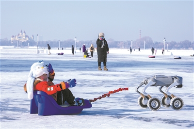 1月11日,小朋友在松花江哈尔滨段江面上体验机器狗拉爬犁。