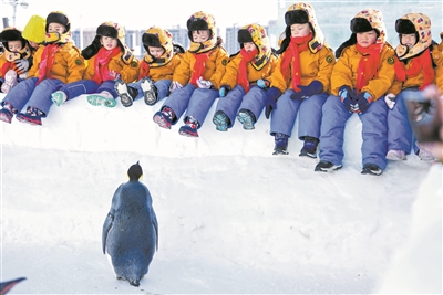 1月14日,广西“小砂糖橘”在位于吉林长春的长春冰雪新天地与企鹅互动。近日,来自广西的十几名3至6岁“小砂糖橘”组成的研学团跨越3000多公里,从温暖南方奔赴东北,开启研学之旅,感受冰天雪地。新华社记者 颜麟蕴/摄